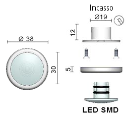 Corpo in ottone tornito, trattato galvanicamente. Diffusore in tecnopolimero fornito nei colori bianco satinato, rosso o blu. Portalampada W2x4,6d completo di lampadina a 12V o 24V. Idonei per montaggio su superfici normalmente infiammabili. Disponibile a richiesta in diverse finiture. Nella versione con LED colorato la lente è sempre bianco satinato.